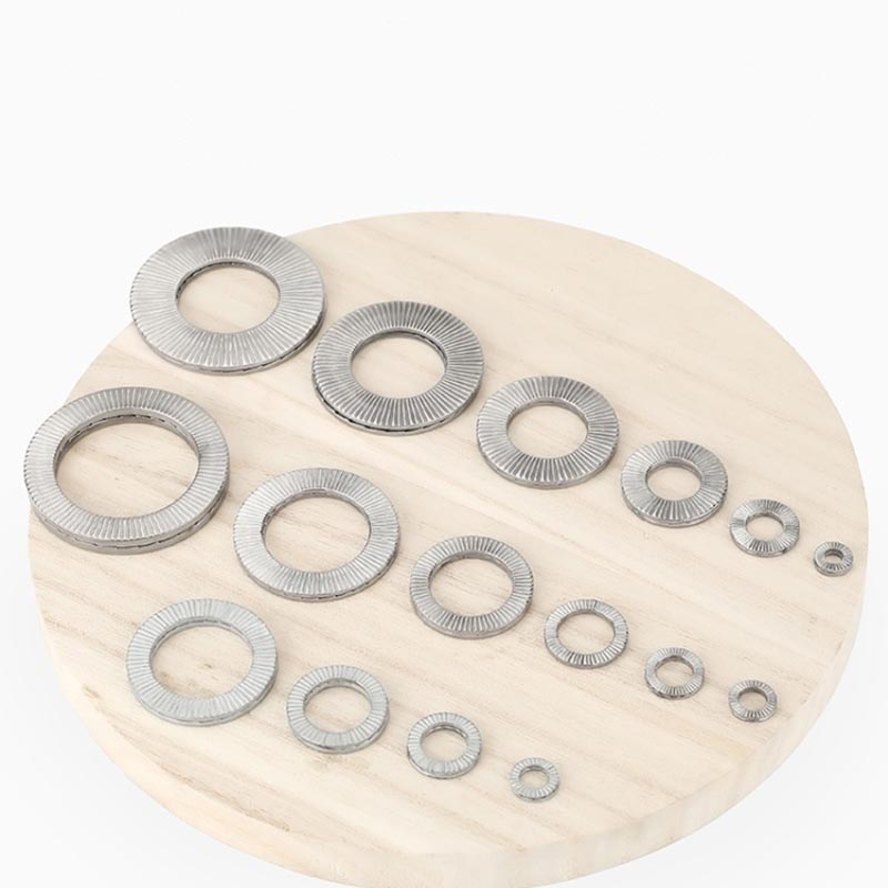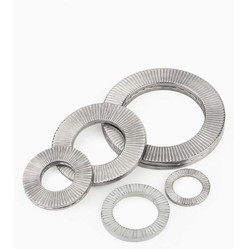 The Dvigubo sluoksnio savaiminio fiksavimo poveržlėyra sukurtas, kad varžtai nebūtų laisvi vibracijos ar judėjimo metu. Jame yra dvi dalys, lankstus plieninis viršutinis sluoksnis ir apatinis sluoksnis su dantimis. Kartu jie sukuria pakankamai trinties, kad užrakintų daiktus.