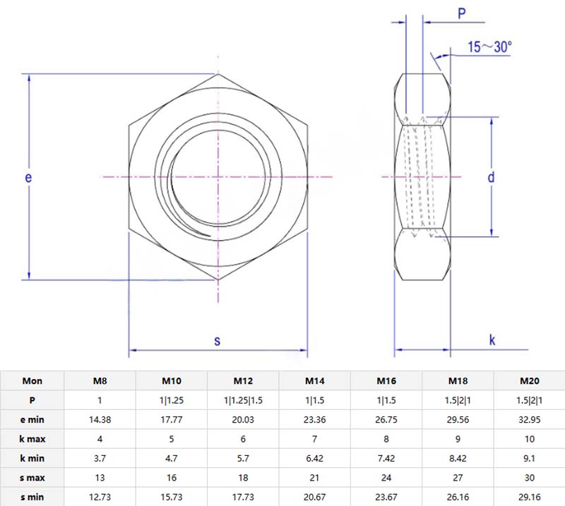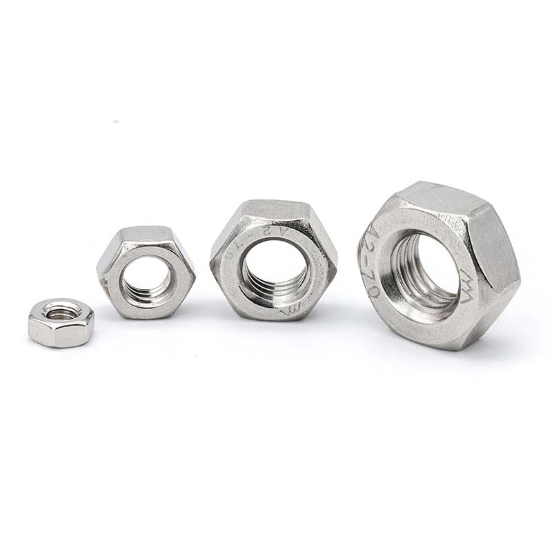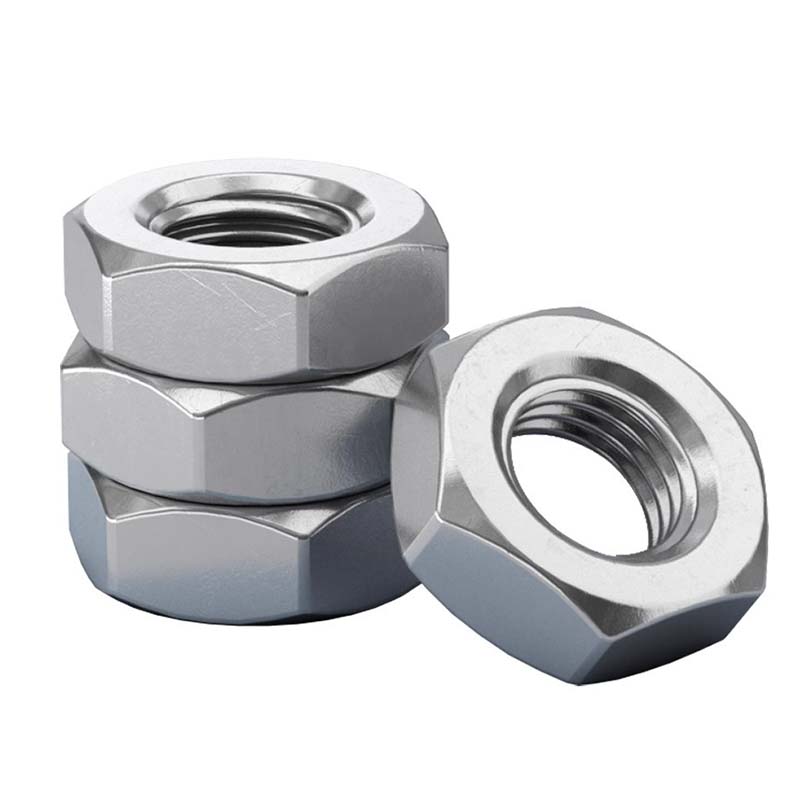 Šešiakampio ploni riešutai su metriniu smulkiu žingsnio sriegiuNaudokite puikų žingsnio sriegį, dažniausiai naudojamos sriegių specifikacijos yra M6X0.75 arba M8X1.0. Palyginti su šiurkščiavilnių žingsnio gija, jo atsparumas smūgiui yra stipresnis. Medžiaga yra nerūdijantis plienas arba žalvaris.