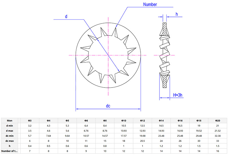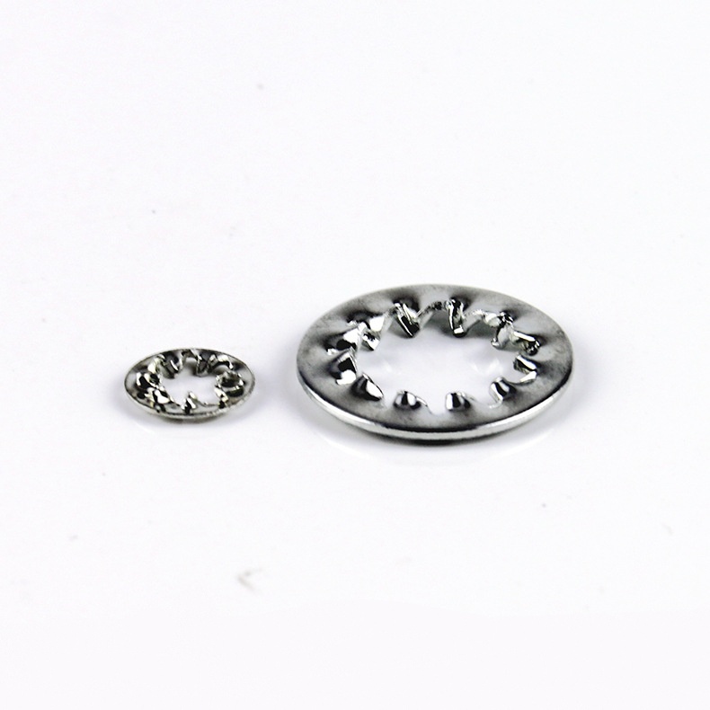 Thevidinių dantų dantyta užrakto poveržlėturi dantytą formą, kad padidintų trintį ir palengvintų sutvirtinimą. Esant vibracijai dėl išorinių jėgų, jis gali būti geriau užfiksuotas. Galima rinktis iš įvairių medžiagų, o tinkamą medžiagą galite pasirinkti pagal naudojimo aplinką ir konkrečius poreikius.