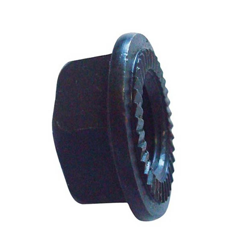 | Vidutinio anglies plieno | Šios dantytos jungės šešiakampės fiksavimo veržlės gali būti naudojamos ant automobilių pakabos komponentų arba priekabos kablių. Jiems naudojamas plienas buvo termiškai apdorotas, todėl dantyta konstrukcija gali tvirtai užsifiksuoti be lūžimo. Jie gali atlaikyti vibraciją važiuojant greitkeliu arba sunkias apkrovas neatsipalaiduodami. Paprastai jie yra padengti storesniu cinko sluoksniu. |