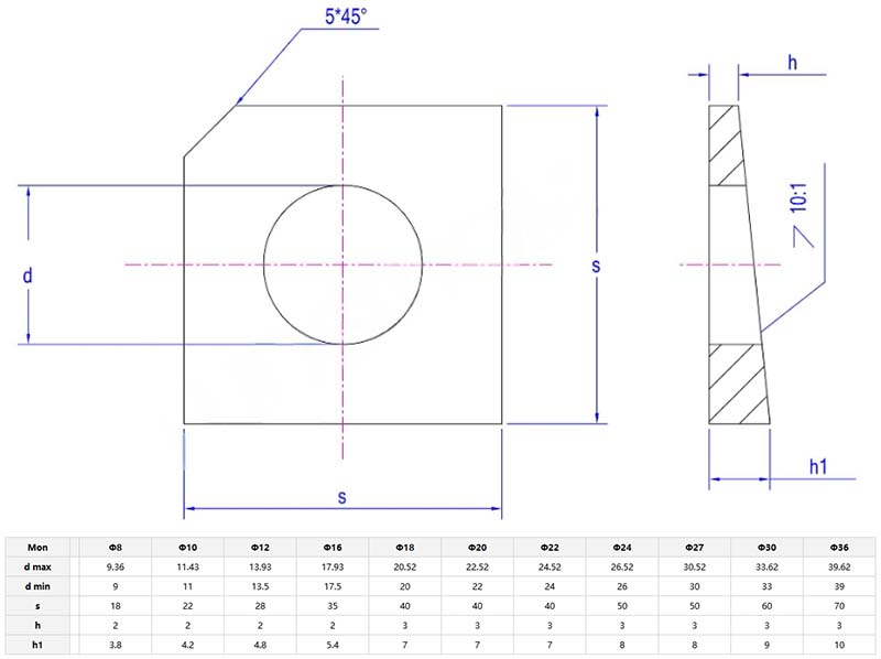 „Square Lowned“ poveržlė yra standartinių dydžių ir gali būti pritaikyta pritaikyti skirtingiems projekto poreikiams. Standartinių dydžių vidinis skersmuo yra nuo 1/4 "iki 2", o storio - nuo 1,5 mm iki 6 mm. Išorinė kvadratinė dalis paprastai atitinka varžtų galvos dydžius, todėl jie veikia kartu. Galite įsigyti pasirinktinių versijų su specialiais kūgio kampais ar didesniais dydžiais, kad galėtumėte atlikti sunkius darbus. Jie pateikia išsamius brėžinius ir dydžio specifikacijas, kad įsitikintumėte, jog poveržlės gerai tinka esamoms tvirtinimo elementų sistemoms.
