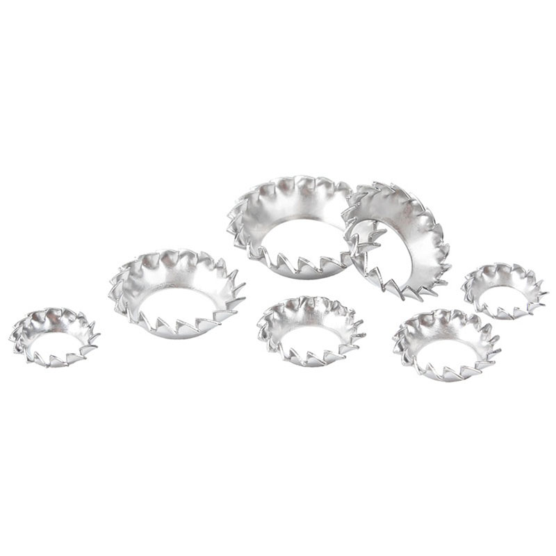 The Kūginė užrakto poveržlėyra kūgio formos tvirtinimo elementas, kuris daugiausia naudojamas siekiant užkirsti kelią varžtui atsipalaiduoti dėl vibracijos ar sunkios apkrovos. Aplink jį yra maži dantys ar keteros. Įdiegus teisingoje padėtyje, keteros sukurs stabilų slėgį tarp veržlės ir jo jungiamojo paviršiaus, todėl jungtis bus saugesnė, ilgesnė ir mažiau linkusi atsipalaiduoti.