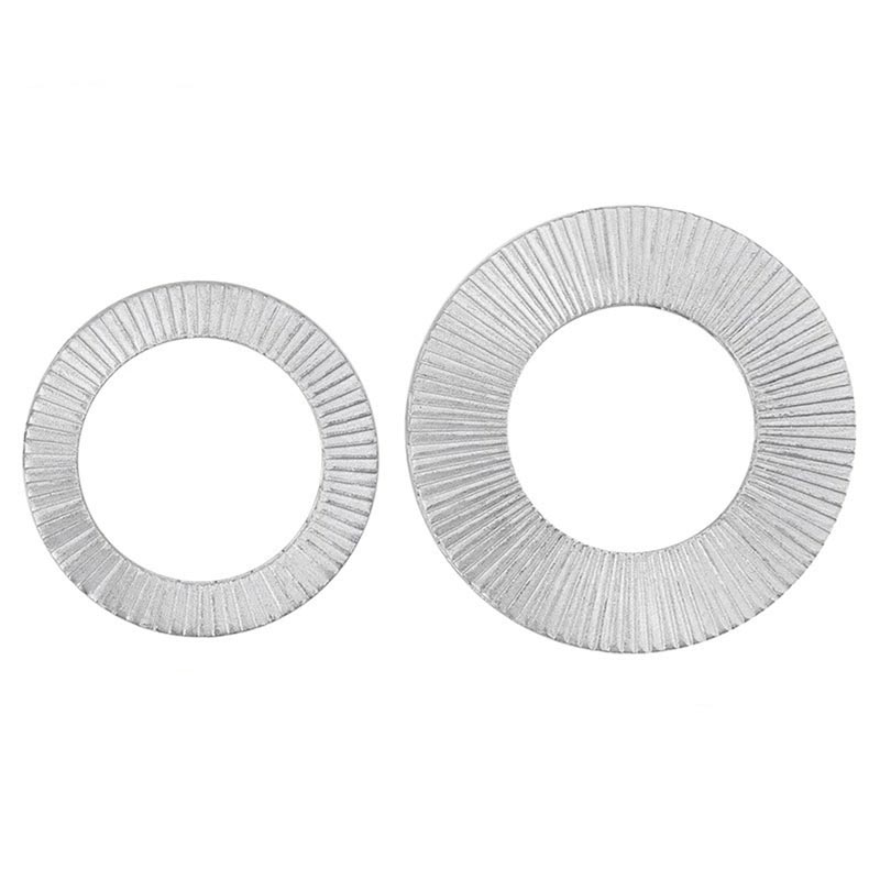 The Dviejų sluoksnių savaiminio fiksavimo poveržlėyra pagamintas iš nerūdijančio plieno arba anglies plieno. Tai reiškia, kad laikui bėgant jis sulaiko ir lengvai rūdija. Viršutinėje dalyje naudojamas spyruoklinio plieno, todėl jis išlieka lankstus ir lankstus. Apačioje yra maži dantys, kurie įsigilina į jūsų pritvirtintą daiktą, kuris padeda jį užrakinti vietoje. Jei naudojate jį grubomis sąlygomis, yra versijų su papildomomis dangomis, tokiomis kaip cinkas ar fosfatas, kad jos būtų griežtesnės.